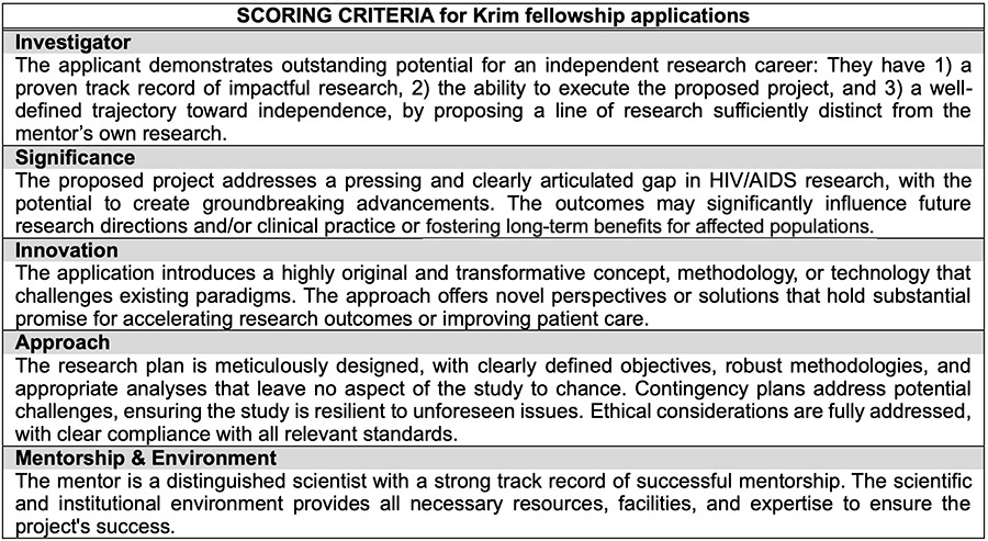 - Krim fellowships are evaluated based on the following criteria: Investigator, Significance, Innovation, Approach and Mentorship & Environment.