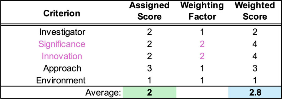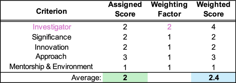 - Each criterion is assigned a weighting factor that reflects its relative importance for the specific grant mechanism.